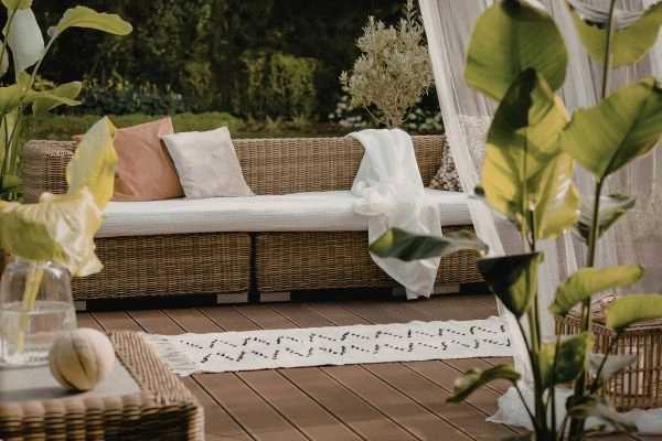 Un simple ensemble peut inclure un canapé modulable, une table basse et quelques plantes en pot. Ajoutez une pergola et des rideaux légers pour plus d’ombre et d’intimité.